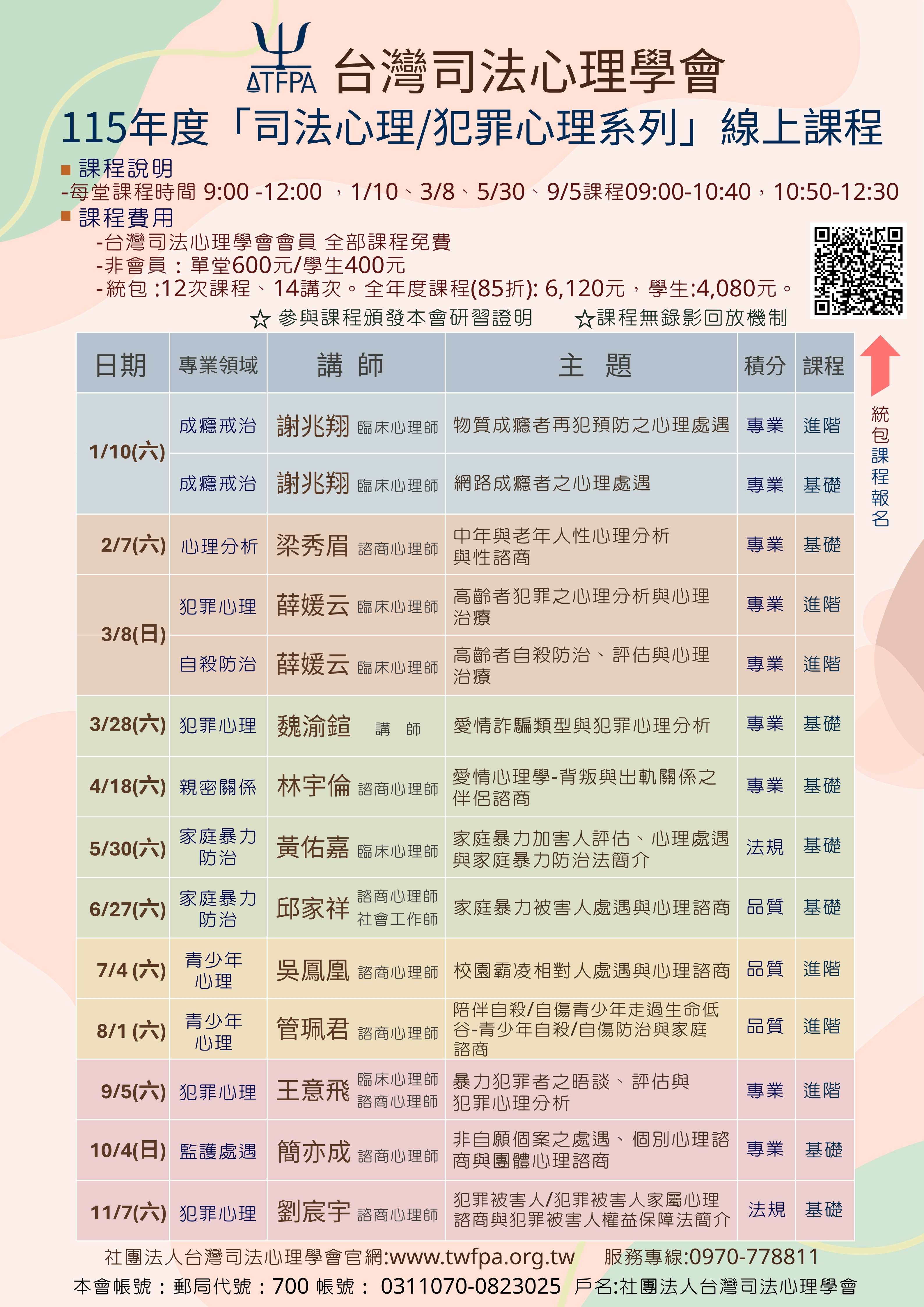 台灣司法心理學會115年度「司法心理/犯罪心理」系列線上課程,